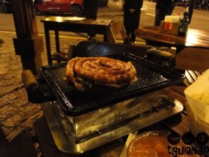 Pedimos linguiça calabresa de metro recheada com queijo na chapa (acompanha cesta de baguetes), R$ 49,80, e apfelstrudel de sobremesa.