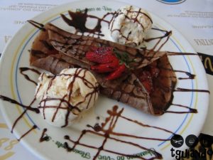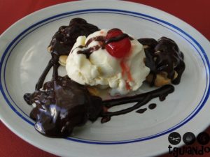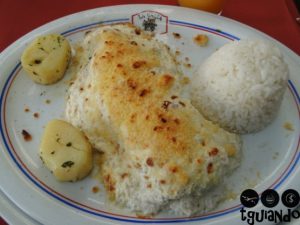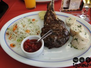 Pedimos truta à Gália (recheada com salmão e molho branco, acompanha arroz branco e batatas), por R$ 56, e prime rib (filé de costela acompanhado por arroz primavera e palmito), por R$ 68. Para sobremesa: profiteroles com calda de chocolate e sorvete de creme, R$ 18,50.