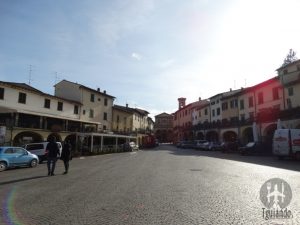 A praça é repleta de pórticos, são verdadeiras galerias arqueadas em 3 lados, onde ficam lojas e restaurantes. Em época medieval nessa praça acontecia o mercado de carnes e em dias de chuva, os pórticos serviam para proteger os animais.