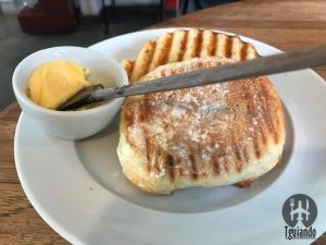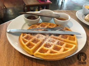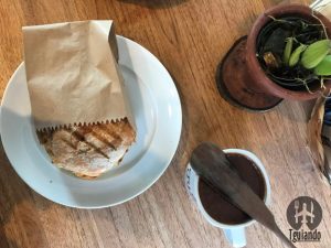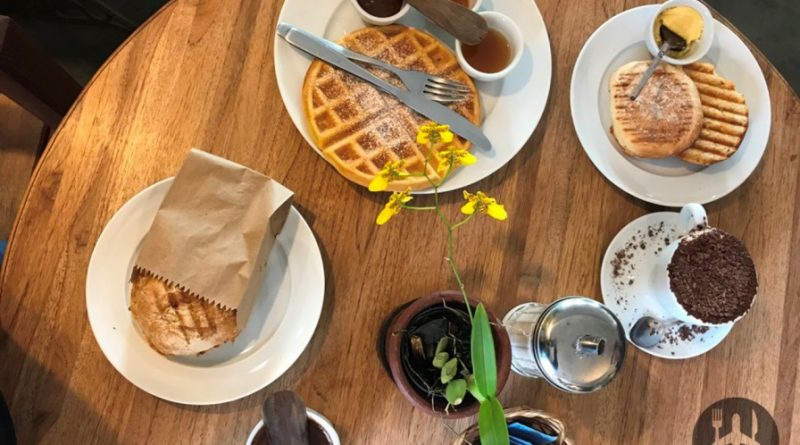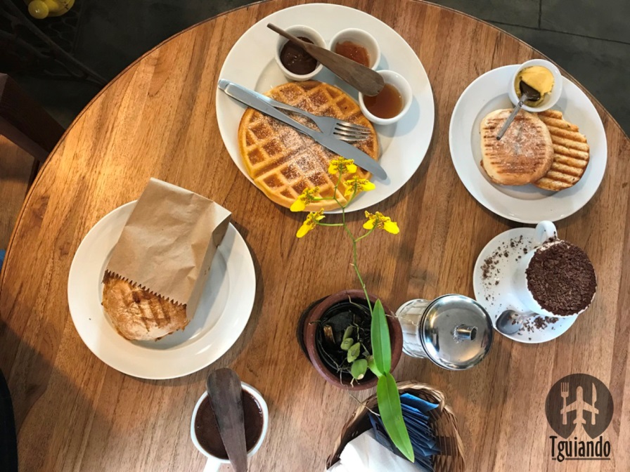 Nossos pedidos foram: chocolate quente (muito, muito, muito cremoso, receita da vovó), R$ 13, cappuccino Fika (o verdadeiro, com raspas de chocolate belga), R$ 13, pão na chapa (nosso pão de ervas prensadinho com manteiga, R$ 7, pão rústico orgânico prensadinho com queijo minas padrão (feito na chapa, pão do dia), R$ 11, e waffle com nutella, geleia e mel, R$ 18.