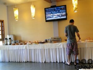 O restaurante acomoda várias pessoas num local bem arejado e iluminado. O café da manhã apresenta muitas opções de pães, bolos e doces, além de ovos mexidos e calabresa.