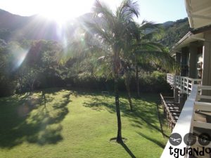 Na manhã de sábado, ao acordarmos, tínhamos a bela visão do jardim e da piscina do hotel.