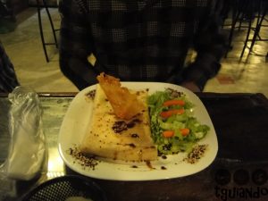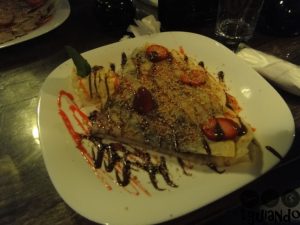 A creperia que estávamos procurando fechou, mas encontramos outra, Ohana Maresias Bar. Foi nesse ambiente agradável que escolhemos onde comeríamos a sobremesa: crepe de chocolate com morangos.