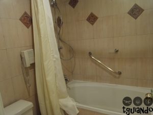 Apesar da suíte ser ampla e bem decorada, no banheiro tinha uma banheira pequena e cortina.