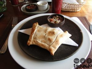 Como chegamos antes do horário de início do tour, resolvemos almoçar ali mesmo, por Ch$ 12.100. Eu escolhi lasanha e o Rafa, uma empanada.