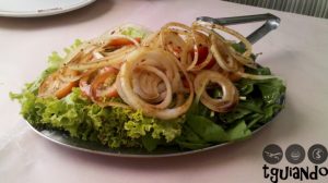 Salada de alface, rúcula, cebola e tomate acompanha os pedidos.