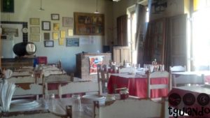 Portas de madeira, toalhas vermelhas e quadros com fotos antigas do local fazem parte do ambiente.