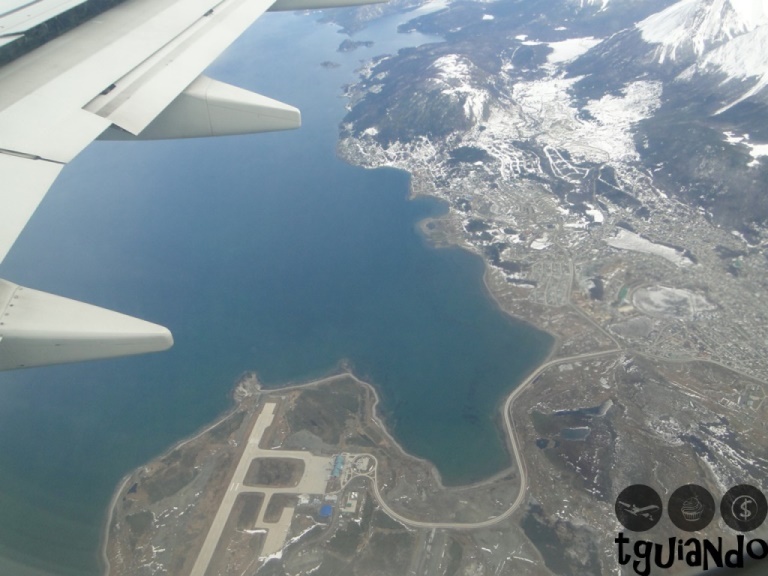 Não sou um especialista em aeroportos, aviões e tão pouco pousos, mas com certeza foi o pouso mais emocionante que já estive. O avião começa a rodear a cidade e parte do canal do Beagle. A aeronave fica bem inclinada em alguns momentos, tanto que é possível ver a cidade e o aeroporto se aproximando.