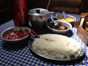 Pedimos o acompanhamento (arroz, feijão, vinagrete, cebolete, farofa e cebola shoyo), R$ 7 por pessoa, com reposição à vontade. Ficamos surpresos quando as porções foram servidas em bacias e caldeirão de alumínio, tudo bem simples, porém, fazendo parte da decoração.