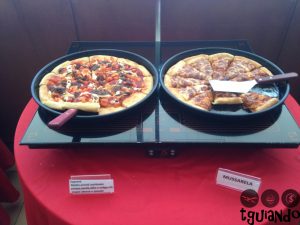 No dia em que fomos, os sabores eram: corn e bacon (mussarela, fatias de bacon e milho), caprese (molho pesto (azeitonas pretas, azeite, alho e óregano), cream cheese e tomate), mussarela, brasileira (mussarela, requeijão, presunto e azeitonas verdes), sauce pepperoni e vegetariana.