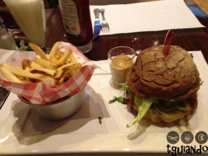 Por ser um pouco tarde para comermos comida, optamos por um lanche, que por sinal estava muito bom, desde a apresentação até o paladar. Escolhemos o caesar burger (hamburger grelhado de picanha de 150g com queijo cheddar, alface americana, parmesão, maionese caesar, no pão integral com gergelim), R$ 21,40, e pub’s burger (hamburger de 150g servido com cebola caramelizada na cerveja preta, provolone grelhado, tapenade de azeitonas, alface frizzé e maionese, no pão australiano, acompanha batatas fritas rústicas e exclusiva maionese de cerveja preta), R$ 30,90.