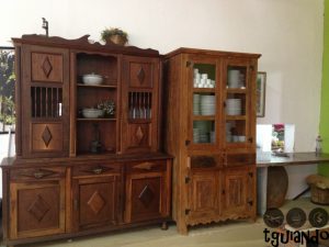Para se sentir em casa, os pratos, talheres e copos, ficam nos armários que ficam próximos ao fogão e cada um pega o seu.