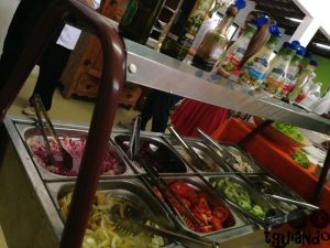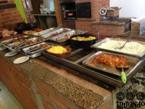 A variedade é grande tanto para as saladas, quanto para os pratos quentes e a reposição é bem rápida. No dia em que fomos tinha lasanha, macarronada, nhoque, linguiça, pernil, frango, além de arroz, feijão, farofa, batata frita e outros.