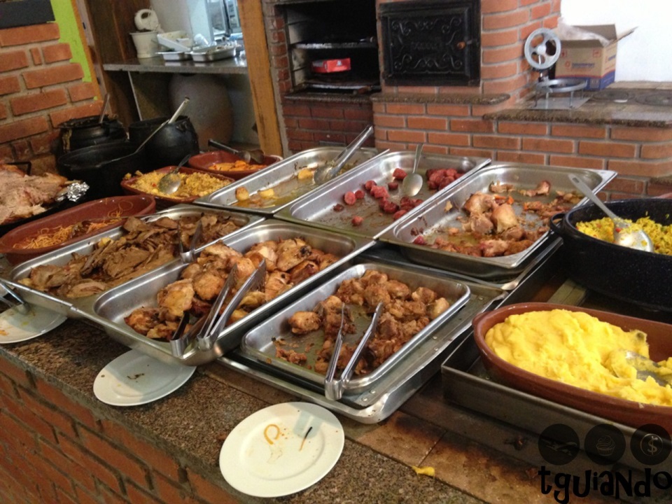 O restaurante possui três salões com mesas para o almoço e, entre eles, está o buffet de comidas frias (saladas) e o fogão à lenha com deliciosos pratos, R$ 30 por pessoa.