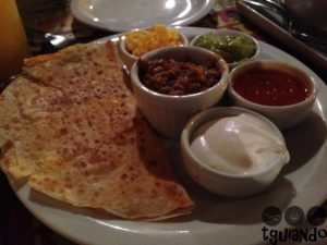 No cupom que compramos tínhamos direito ao rodízio, bebida (mojito) e sobremesa para duas pessoas. Ao chegarmos, fomos questionados se conhecíamos o local e, como dissemos que não, o garçom foi atencioso e nos explicou o que estava incluso no rodízio e o que compunha cada prato. Degustamos de nachos (tortillas de milho crocantes, acompanhando chili, guacamole, sour cream, molho de salsa e queijo ralado), quesadilla (tortillas de trigo macias com queijo e batatas rústicas), tacos (tortillas de milho crocantes, em forma de concha, recheados com alface, tomate, queijo ralado e carne) e burrito (tortilla de milho macia enrolada com carne, alface, tomate e queijo ralado).