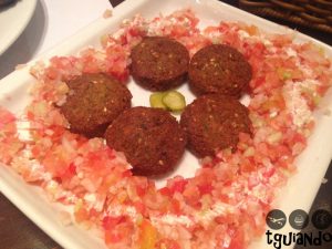 Numa outra ida ao restaurante, experimentamos o falafel (crocantes bolinhos à base de grão de bico e sementes de gergelim, regados ao molho de tahine; acompanham pequenos cubos de tomate, pepino, pickles, cebola e o nosso pão sírio), R$ 31,70.