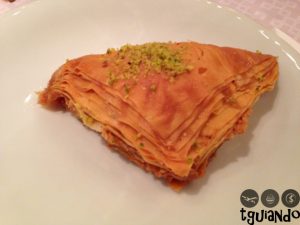 De sobremesa, pedimos o bekleua (massa folhada salpicada com pistache, recheada com nozes e castanhas), R$ 7,50, malabie damasco (manjar árabe, preparado com misky, coberto com calda de damasco), R$ 9,90, e Ataif (delicado crepe recheado com nozes e castanhas), R$ 9,90.
