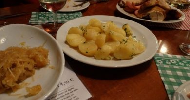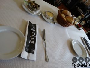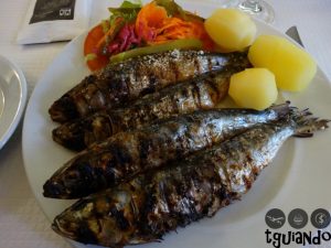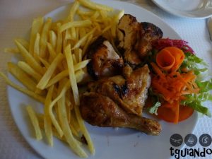 Sempre escolhendo comida da região, escolhemos sardinhas assadas, € 7,95, que veio com batatas cozida e salada, e frango no churrasco, € 7,5, com batata frita e salada. Ficamos surpresos com as porções servidas como individuais. Gostamos muito de tudo, desde a apresentação, sabor, quantidade e valor dos pratos.