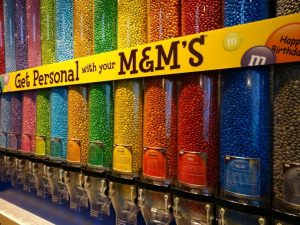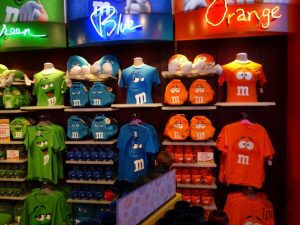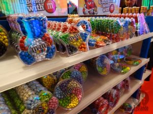 A loja é enorme, com tudo quanto é produto com os bonitos M&M’s estampados, sejam camisetas, almofadas, copos, canecas, pantufas, bonés e claro, os chocolates. Achamos muito divertido os chocolates personalizados, onde você escolhe a cor e o que será impresso.