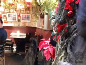 Dentro, o ambiente é bem escuro, com objetos pendurados como decoração. No bar, algumas poucas mesas altas para aqueles que tem apenas a intenção de passar por ali para beber. Em um outro ambiente, mesas grandes com bancos, para uma refeição mais demorada.