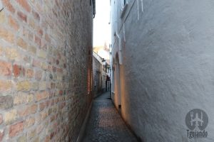 Durante nossas pesquisas, encontramos como a rua mais estreita do mundo. Assim, nosso roteiro começou por aqui e quase passa despercebido, pois é uma travessa apenas com uma placa com o nome da rua no alto da parede.