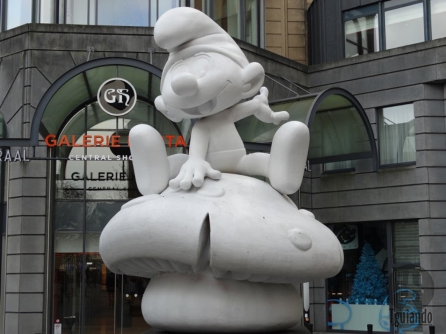 Schtroumpfs, a mais nova estátua de Bruxelas, a estátua do Smurf sentado em um cogumelo fica bem em em frente a entrada do MOOF e da Smurf Store. A estátua de 5 metros de altura é totalmente branca.