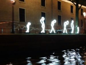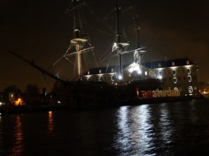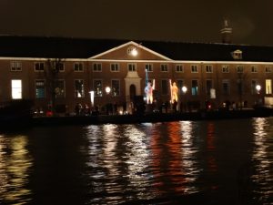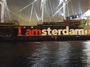 Em nossa segunda e última noite, fizemos o passeio noturno de barco saindo da Stadhouderskade às 19h com duração de aproximadamente 1:30h. Compramos os bilhetes, € 17,5, ali mesmo pouco antes da partida do barco. Apesar do cansaço do dia, foi um passeio legal, podendo ver alguns pontos da cidade de outro ângulo, além das iluminações dinâmicas nos canais.