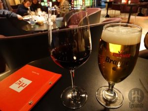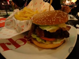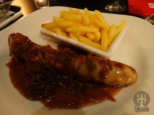 Na primeira noite, optamos por jantar aqui mesmo, já que perto do hotel só tinham opções de fast food e não estávamos a fim de ir até o Centro. Pedimos zunftbratwurst (bratwurst with onion sauce and french fries), 24, hausgemachter cheddar burger (homemade cheddar burger with salad, tomato and pickles), 26.