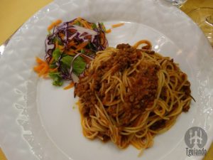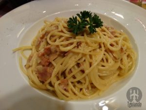 O antipasti ficou por conta da caprese con mozzarella di bufala (buffalo mozzarella tomato Brasil orégano), € 12,9. Os pratos foram gnocchi al formaggi (salsa de queso mixta), € 12,9, spaghetti alla carbonara (con huevos panceta panne), € 13,9, spaghetti alla bolognese (con tomate y carne), € 12,9, spaghetti con polpete (con albondigas y tomate), € 15,9, filetto di manzo al ferri, € 21.