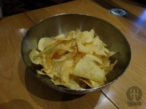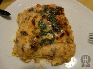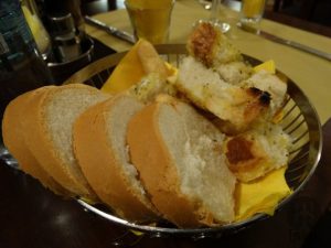Depois de nos servirem as entradas, nos disseram que a massa da lasanha havia queimado e teriam que refazer e, como pedido de desculpas, nos trouxeram algumas massinhas fritas, bem sequinhas e crocantes.