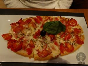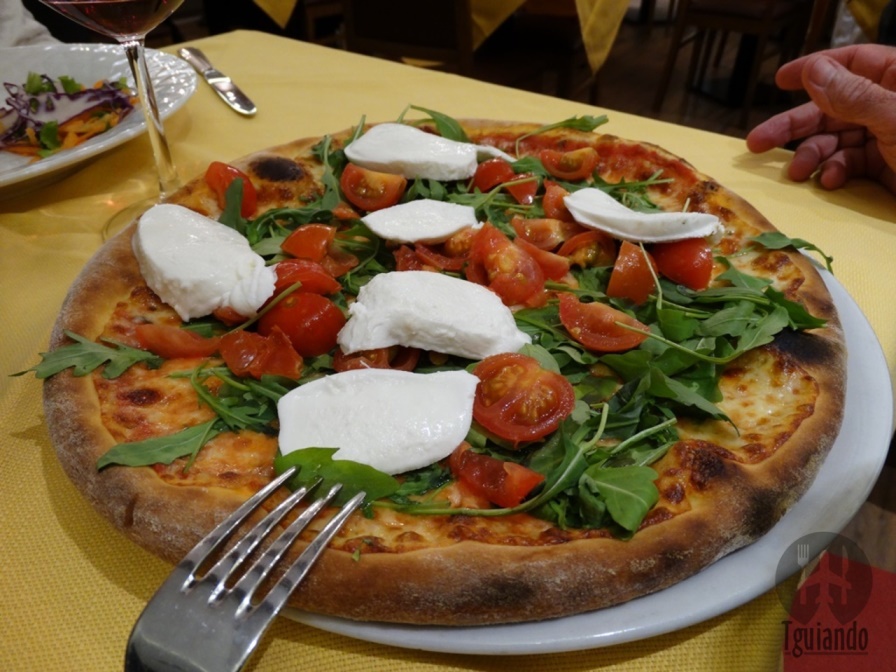 Além do menu fixo, pedimos bruscheta pomodoro, € 7,5, pizza caprese (pomodoro, mozzarella, mozzarella de bufala, tomate cereja e rúcola), € 10,5.