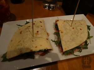 A ideia era pedir vários petiscos e dividir, então nossas escolhas foram: toast breakfast (pan, formaggio, pancetta, frittatina), € 5,8, santa croce (prosciutto corro, formaggio cremoso, pomodorini, rucola), € 5,5, bruschette classica (pomodorini, mozzarella, barilico, oregano), € 6,2.
