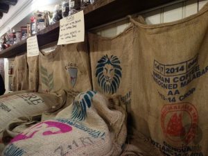A loja não é muito grande e fica tudo visível: sacos de juta, grãos de café, pó de café, xícaras e utensílios para o preparo. Seja paciente, pois fica lotada, apesar do atendimento ser bem rápido. Pedimos café e cappuccino, € 5.