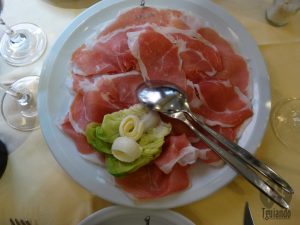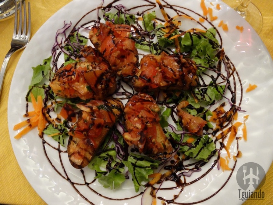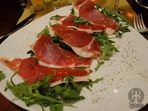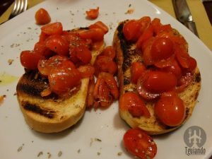 Para começar (antipasti di carne), pedimos bruschette com pomodoro olio di oliva e aglio, € 8,5, e prosciutto crudo, € 13,50.