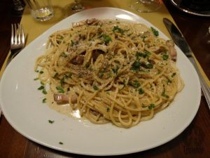 Os pratos principais (primi di carne) foram spaghetti alla carbonara, 12,5, e lasagne alla bolognese, € 11,5.