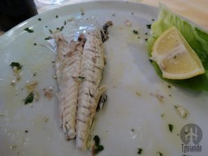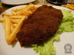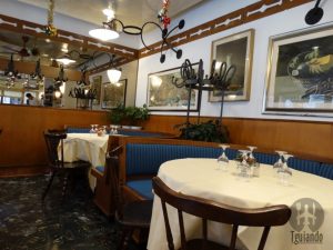 Com toalha xadrez vermelha, móveis em madeira escura, atendimento não muito simpático, mas rápido. Foi aqui que almoçamos.