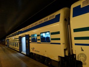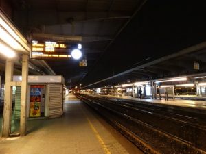 Na primeira noite em Veneza, chegamos tarde e muitos optaram por comer algo no hotel ou ali por perto. Exceto nós, curiosos em estar em Veneza, não aguentamos esperar pelo dia seguinte. Então mal deixamos as malas no hotel e partimos para a estação Venezia Mestre com destino a Venezia Santa Lucia, € 1,25, cerca de 20 minutos.