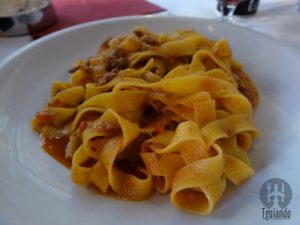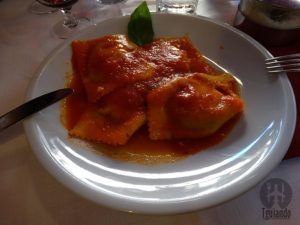 Escolhemos lasagne della casa, € 12, tagliatelle all’anatra, € 12, gnocchi al pesto, € 10, e ravioli al pomodoro, € 10. Além de arista al rosmarino, € 9, carne de porco.
