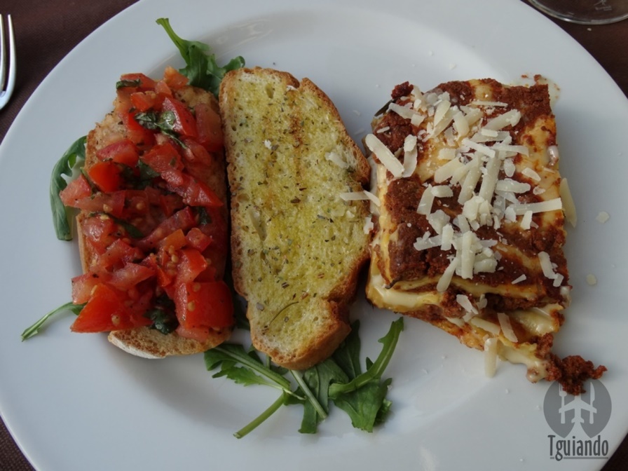 Não resistimos a bruschetta + lasagne al forno, € 11, e bistecca alla fiorentina con patate + bicchiere Chianti, € 22.