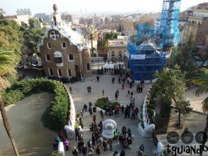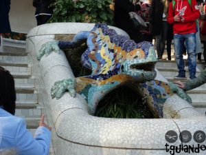 No alto da escadaria, antes de entrar, um lagarto todo trabalhado em mosaico nos dá as boas vindas. Esse lagarto virou um dos símbolos do local e ícone da obra de Gaudí. Junto à entrada principal do parque estão duas casinhas que parecem saídas de um conto de fadas. Uma delas funciona como loja, enquanto a outra, a Casa do Guarda, abriga exposições audiovisuais sobre o passado do parque.