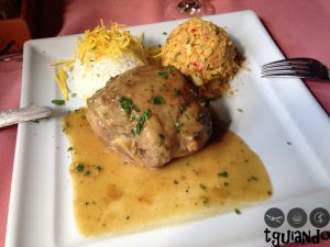 E eu acabei pedindo cotoleta (filé mignon com queijo e presunto parma, ao molho branco, gratinado com parmesão, acompanha legumes gratinados e arroz), R$ 52,50. Humm…
