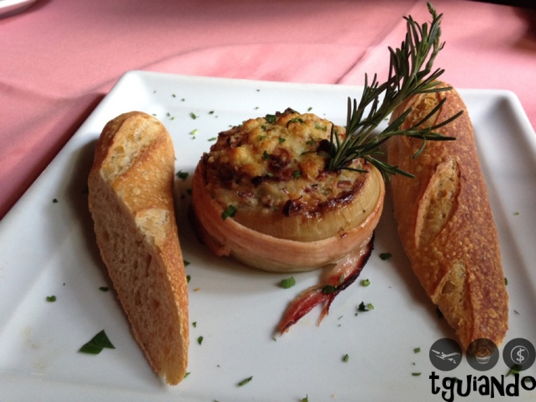 De entrada pedimos os dadinhos de tapioca, R$ 19. Deliciosos!! Não resistimos a curiosidade e acabamos pedindo também a cebola imperial (cebola ao forno, recheada com carne seca, queijo e alecrim, envolta com bacon e pães de acompanhamento), R$ 19,50. Mesmo não gostando de cebola, estava muito boa.