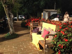 Tem um ambiente rústico em meio à natureza, com toalhas coloridas, redes e sofás para descansar após o almoço ou aguardar uma mesa.