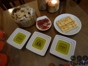 Enfim, chegamos na parte das degustações, onde são servidos 3 vinhos (branco, rosê e tinto) e 3 azeites (suave, médio e forte), além de água, bolachas, presunto e pães.
