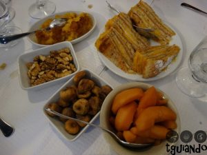 Estávamos mais que satisfeitos quando ele nos trouxe a sobremesa, ou melhor, as sobremesas!! Tinha pêssego, figo seco, nozes, encharcada (ambrosia, doce de ovos) e um bolo com camadas de massa fina e recheio, simplesmente maravilhoso!!