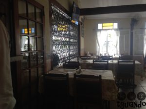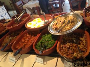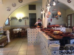 Logo na entrada, diversas bebidas para aperitivo e bancos para espera. Na próxima sala, fogão à lenha com pratos quentes e ao lado buffet de pratos frios, além das sobremesas no canto esquerdo e algumas mesas encostadas nas paredes. Tem um corredor que dá acesso a outro restaurante, do mesmo grupo, para usar as mesas quando necessário.