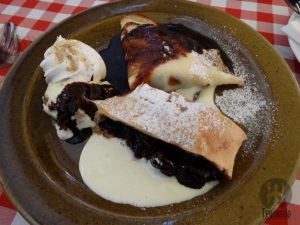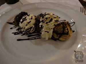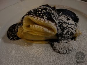 Sobremesa: somló sponge cake (chocolate and vanilla sponge cake with vanilla cream, raisin and walnut with chocolate sauce), 1290 Ft, 1200 Ft, e hungarian dessert foretaste (somló sponge cake, sour cherry strudel and gundel pancake), 1600 Ft. Pão de ló de chocolate e baunilha, com creme, passas, nozes e calda de chocolate, panqueca recheada com nozes, passas e calda de chocolate e, por fim, claro que não podia faltar: a degustação de sobremesa com o bolo pão de ló, strudel de cereja e panqueca… Deliciosas!!