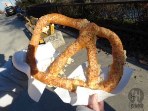 Ah, nosso primeiro dia na cidade e, após o café da manhã, saímos a pé para conhecer as redondezas. Claro que, ao ver algo típico e diferente para comer, paramos, mesmo sendo pão. Mas era um pão diferente, tipo bretzel, só que gigante!! Compramos um (com parmesão), uma cerveja e água, 2000 Ft.