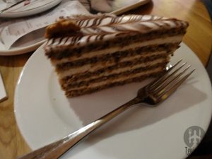 Pedimos café, 790 Ft, cappuccino, 890 Ft, hot chocolate, 890 Ft, e a torta, que infelizmente não lembramos o nome nem o valor.