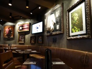 O lugar é grande com muitas mesas, bonito, com móveis em madeira escura, couro e objetos pendurados como decoração.